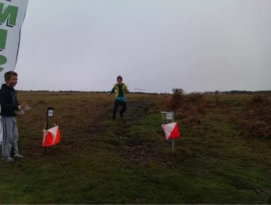 After negotiating the car park entrance, with pushed assistance in many cases due to the muddy slope, the team congregated around Judy and Roger‘s car to collect dibbers, compasses and coach‘s pep talk. A 1k walk to the start as a warm up and then an explanation of how the start procedure works as they were not used to the box system. With Amy, Jo and Tate off first the team were ready. With the start kite out of view, and approached using a taped route, it did prove confusing for some and led to some long times to punch the first control. Once they got used to the leats and earth walls as line features, the soggy shoes, a very orange map and a few navigational errors sorted out by asking or joining forces all of them completed the course smiling and at a sprint as demonstrated by Tom Haslar below.