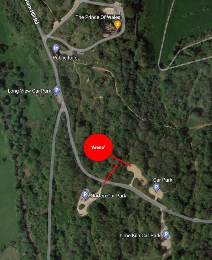 The main car park for the event (labeled 'Car Park' in the image above) is on Ham Hill Road (50.9459, -2.7421 - Google). You can also use the Norton Car Park or Lime Kiln Car Park. The car parks are not for our exclusive use, so please park responsibly and considerately. The 'arena' is a short walk from the car parks and will be tapped as per the red arrows.