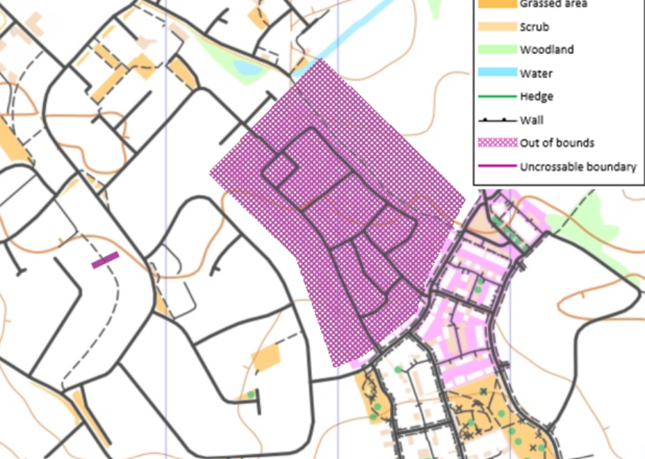 There is one area still under construction where the roads have been open and closed at different times in my recce visits. Even the PROW has been variously closed or diverted in different ways. The map in that area cannot be guaranteed to be up to date, so in the interest of fairness the area has been marked OOB.